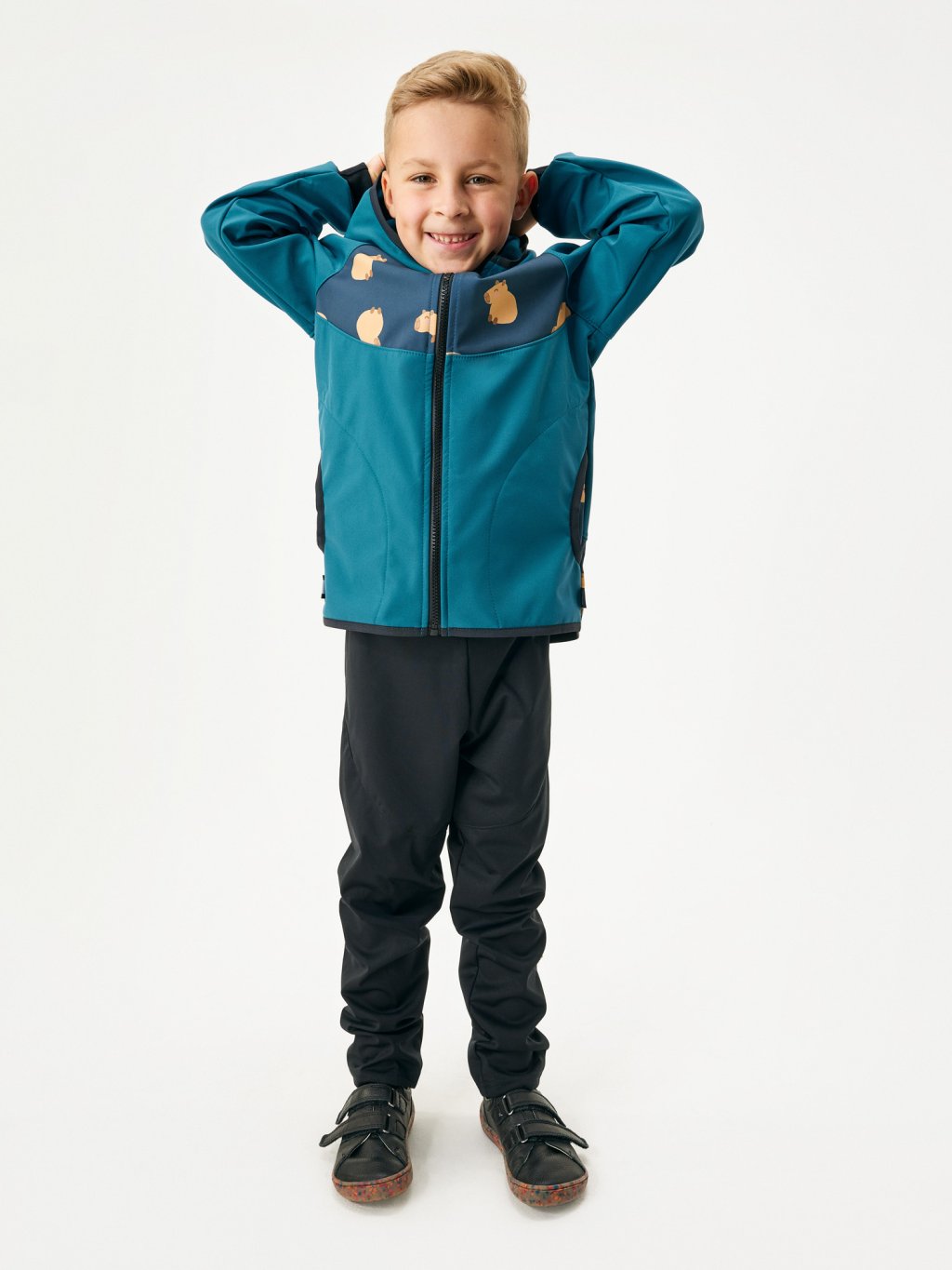 Material from the cosmos, maybe mums just dream. It's warm when it blows around, but when the sun shines, the special membrane makes sure that the kids don't sweat in it. Today, this material is mainly made from recycled PET bottles. Smaller children will use this material on their jacket all year round, but if you want to know when to use it, look at our guide. The material is not completely water-resistant, like a raincoat, but it can handle smaller rains easily. Small accidents can only be wiped with a cloth. Softshell is fitted with a special treatment with high resistance in the abrasion. Water resistance: