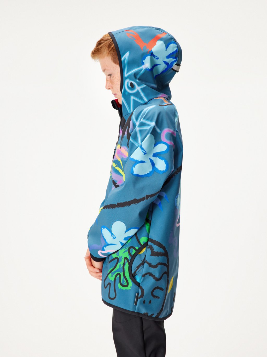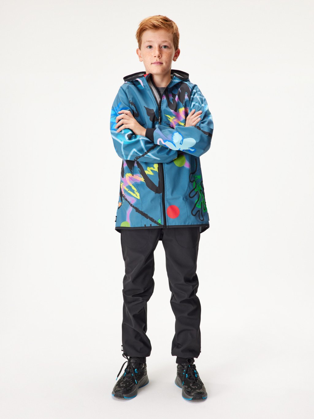 Material from the cosmos, maybe mums just dream. It's warm when it blows around, but when the sun shines, the special membrane makes sure that the kids don't sweat in it. Today, this material is mainly made from recycled PET bottles. Smaller children will use this material on their jacket all year round, but if you want to know when to use it, look at our guide. The material is not completely water-resistant, like a raincoat, but it can handle smaller rains easily. Small accidents can only be wiped with a cloth. Softshell is fitted with a special treatment with high resistance in the abrasion. Water resistance: