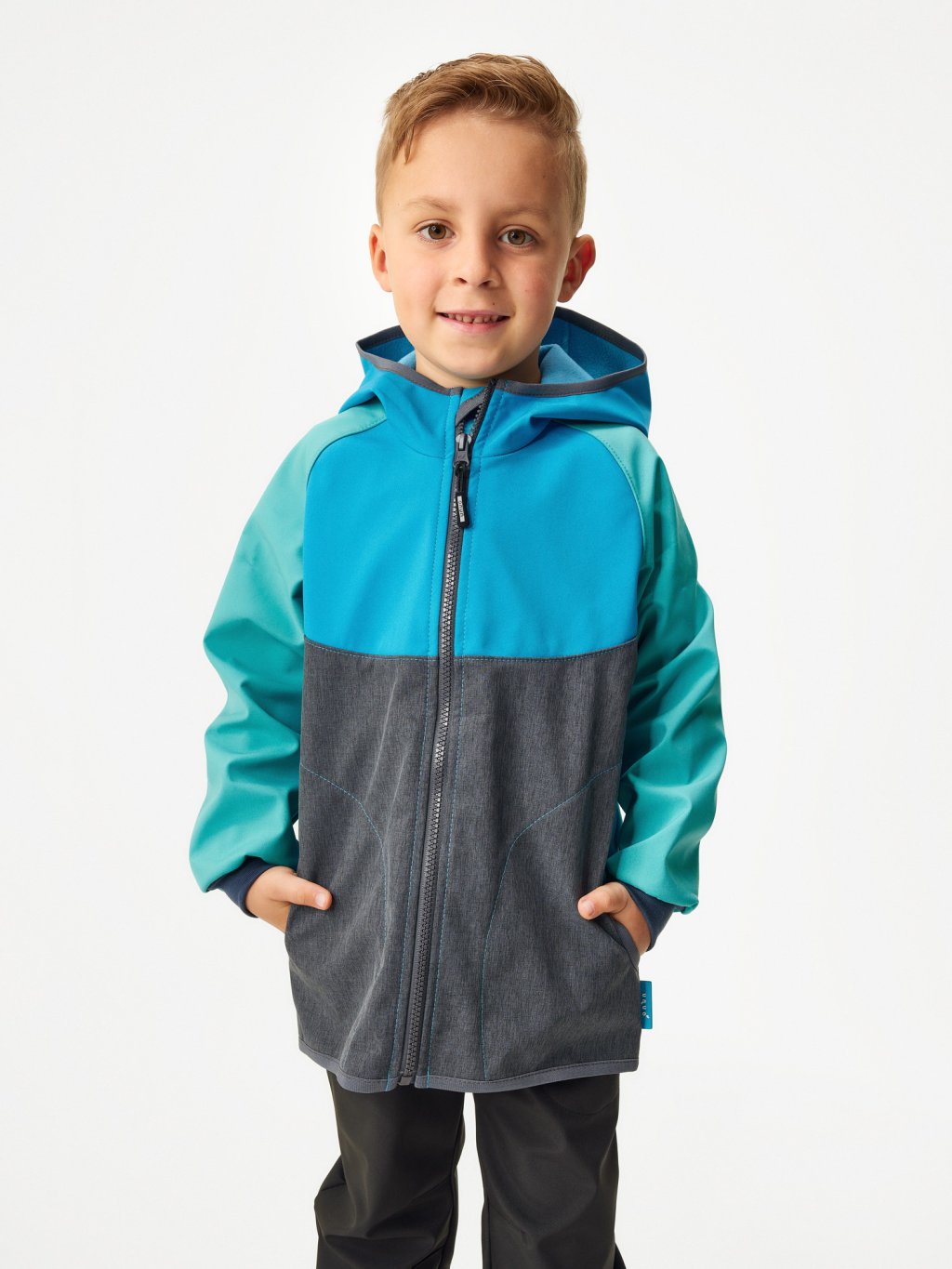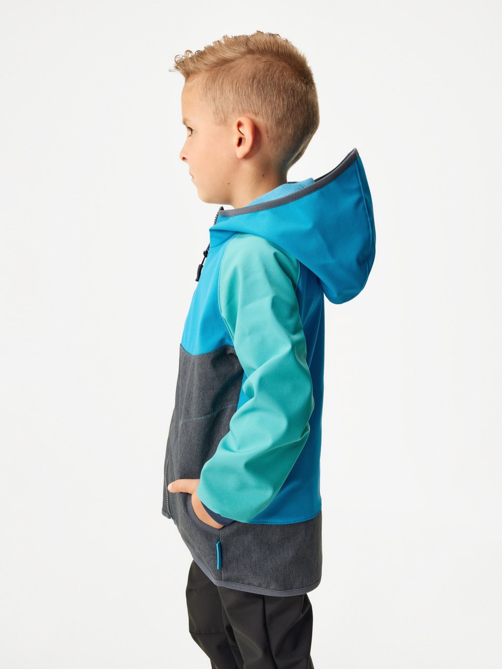 Or you can go out right now, you don't have to wait for the rain to stop, because our jackets will protect your children in a short downpour, without the need to run under the nearest roof. The elastic cuffs at the sleeve ends guard against wind and ensure the jacket grows with the child, quite literally For all children whose adventurous passion never sleeps, we present a softshell jacket with an extended cut! In this jacket, your child can fully focus on exploring nature without wasting time pulling the jacket down. Safety first, that's why you will find several reflective elements on our pieces. Who says outdoor style has to be boring? With this design of sparkling colors and modern cuts, your little explorers and you will look like stars on the field of adventure!