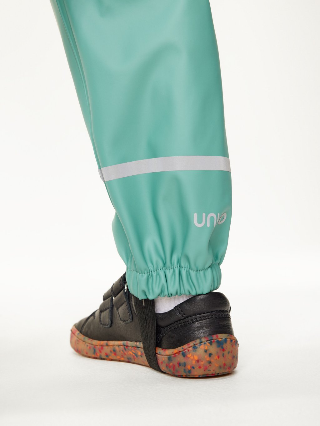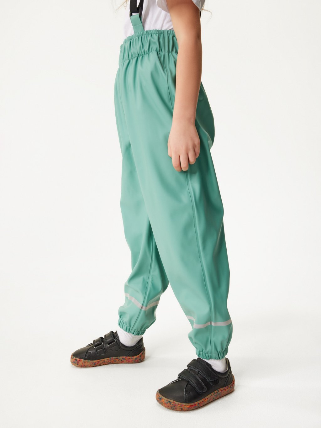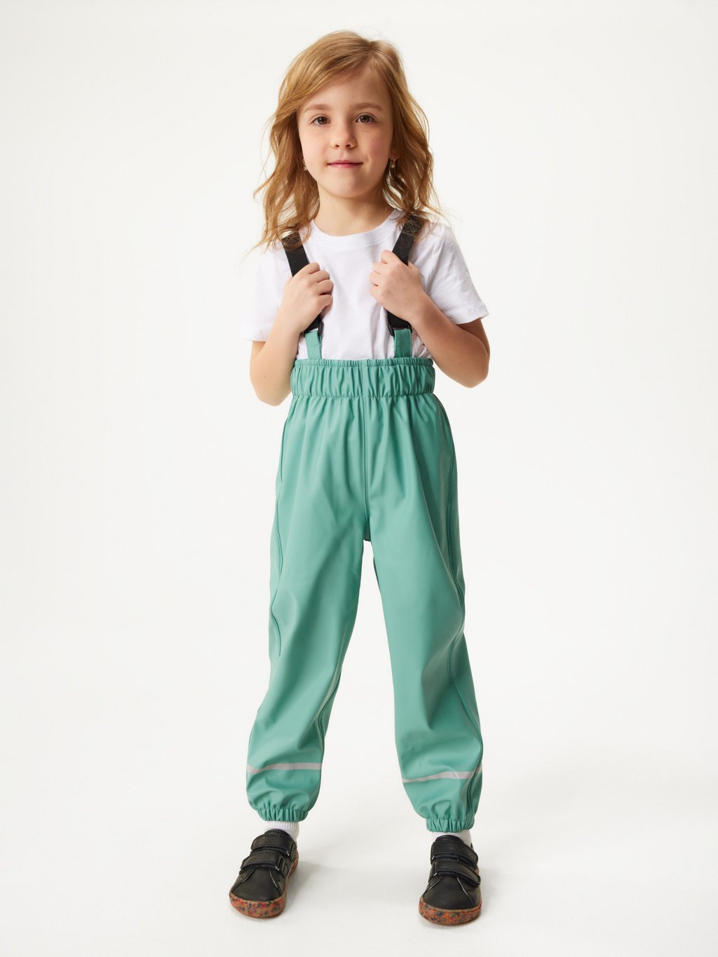 Rain, mud and puddles will no longer be an obstacle to your adventure! These kids' waterproof trousers are made of durable material with sealed seams so they won't let a drop of water through. Thanks to elasticated leg elastics, legs stay dry even in heavy downpours, while reflective elements on the legs increase safety in low-light conditions. In addition, they have a handy elastic band in the legs that can be attached to the shoe to keep the trousers in place and prevent water from getting in. The comfortable fit with elasticated waistband and adjustable suspenders ensure the trousers fit perfectly and do not restrict movement. The suspenders can also be completely detached so the pants can be worn without them as needed. The perfect choice for children who want to enjoy outdoor play in all weathers! The waterproof collection is designed in the Czech Republic and sewn by a foreign sewing workshop.