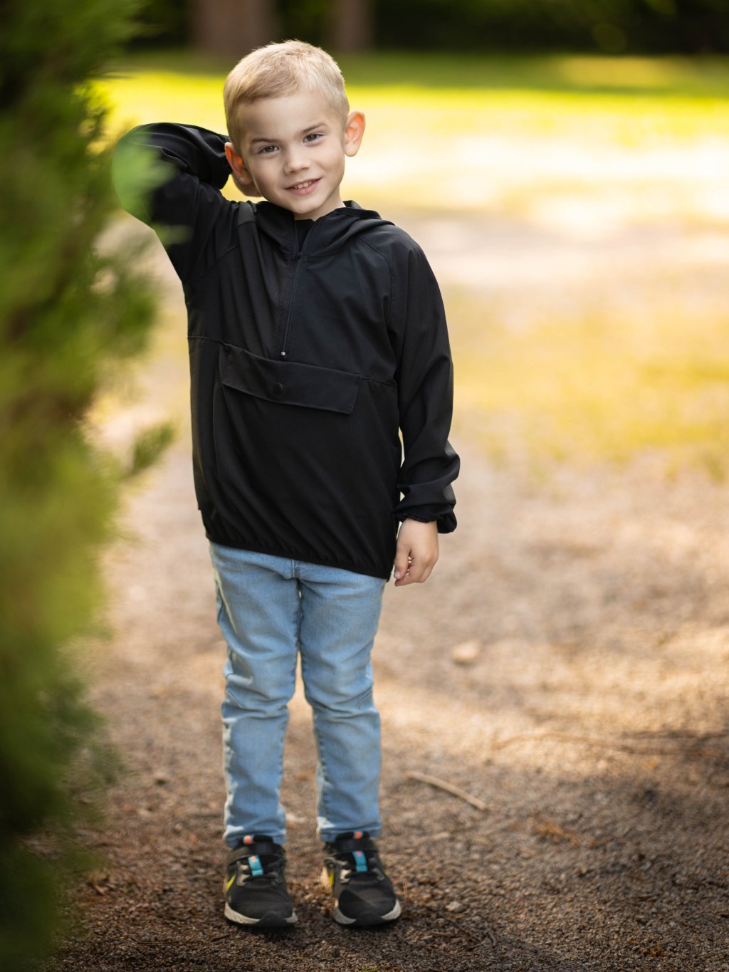 This kids windbreaker is great for any trip or outdoor adventure. It fits over the head and has a handy pocket to easily pack it in. Just stash it in your backpack and be ready for all your adventures.