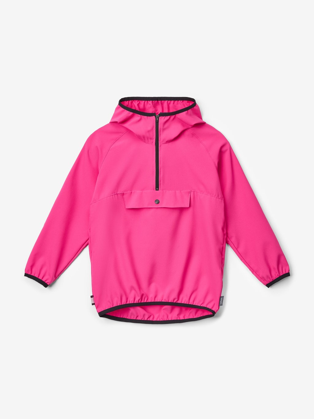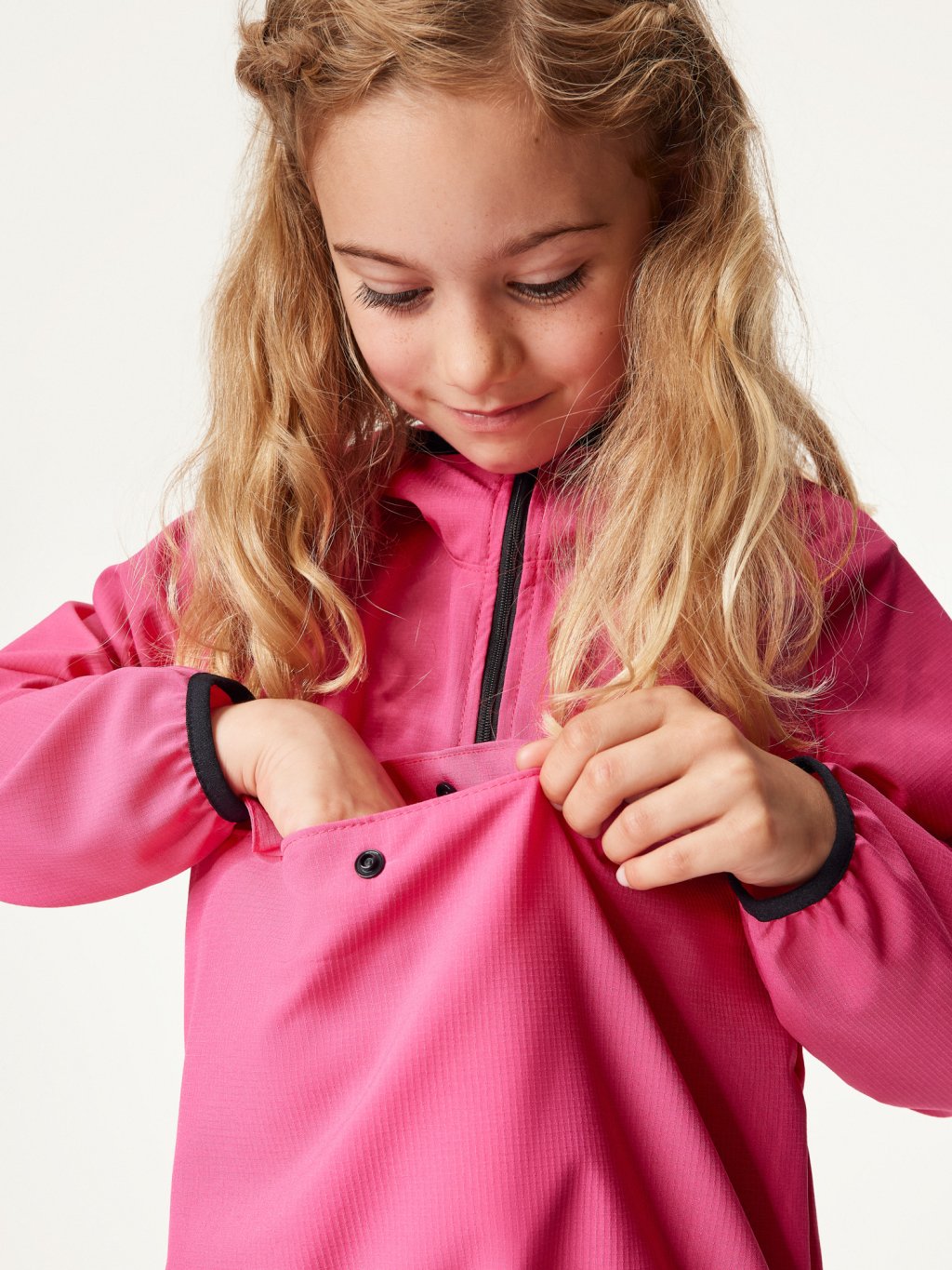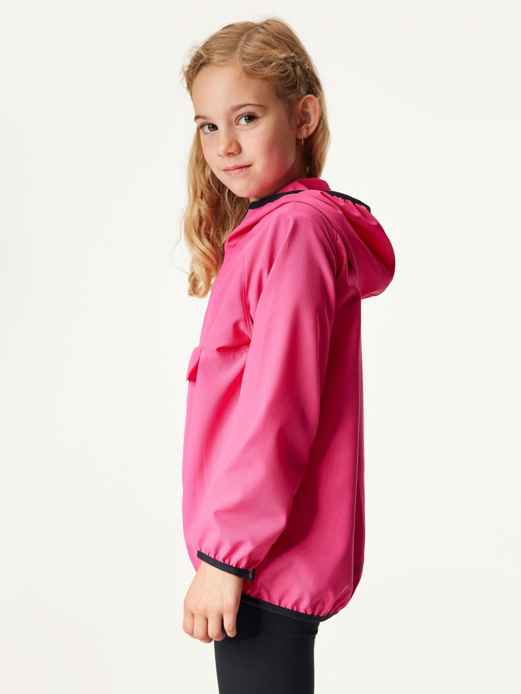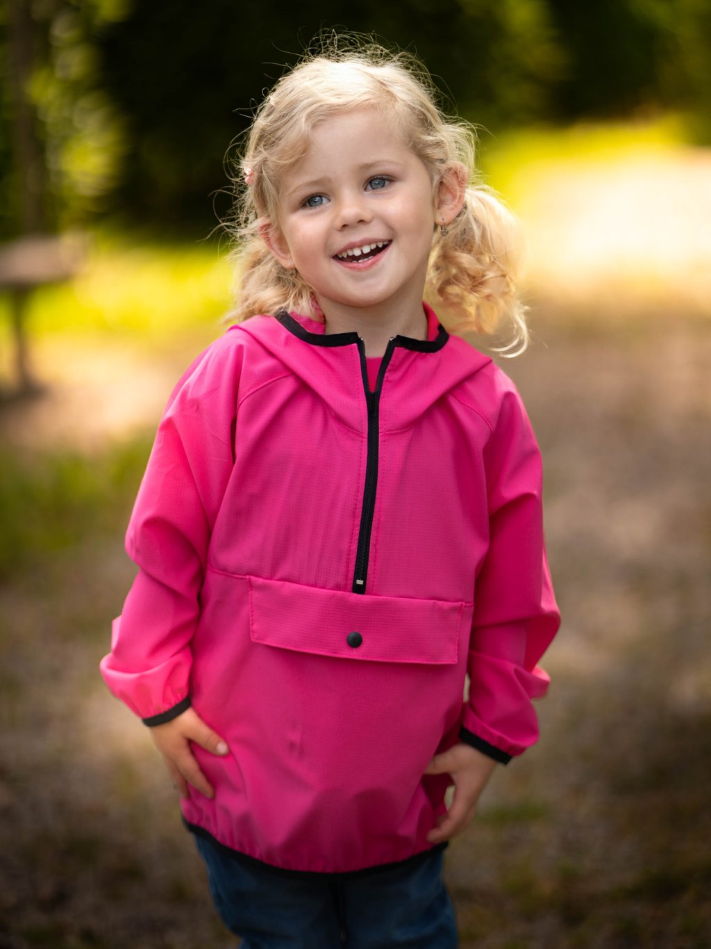 This kids windbreaker is great for any trip or outdoor adventure. It fits over the head and has a handy pocket to easily pack it in. Just stash it in your backpack and be ready for all your adventures.